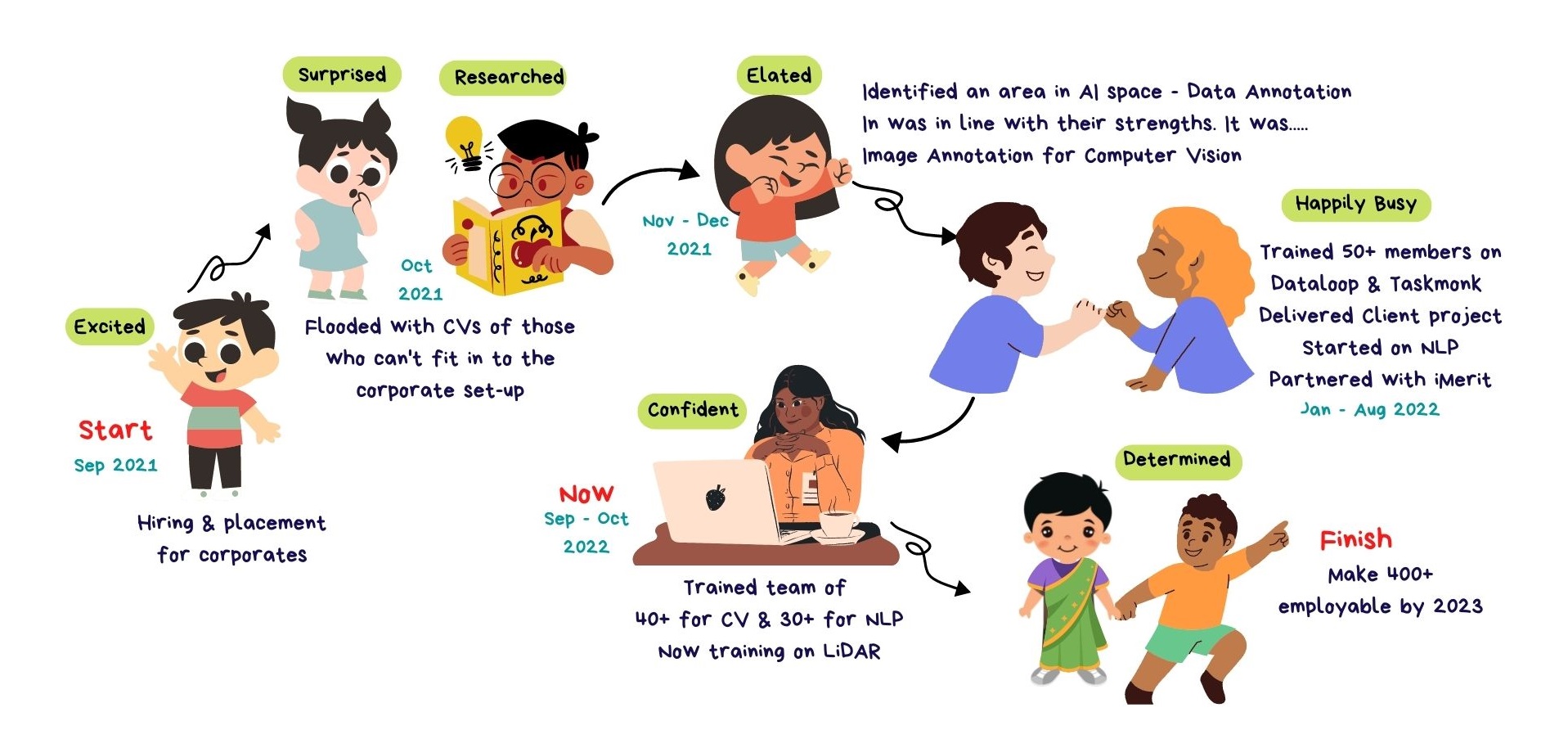 We started attending AI conferences. We connected to iMerit one of the leading data annotation service providers in India who were as excited as we were to explore this intersection of neurodivergence & AI. Together we figured out a way to work together. Soon, our group was on the iMerit L&D platform being tested for their annotation` skills. All did well scoring over 90% in record time. Maybe it had something to do with them already being trained and certified by Orchvate, maybe it was the sheer resilience and focus of the group, maybe it was really empathetic trainer from iMerit, maybe it was all three.