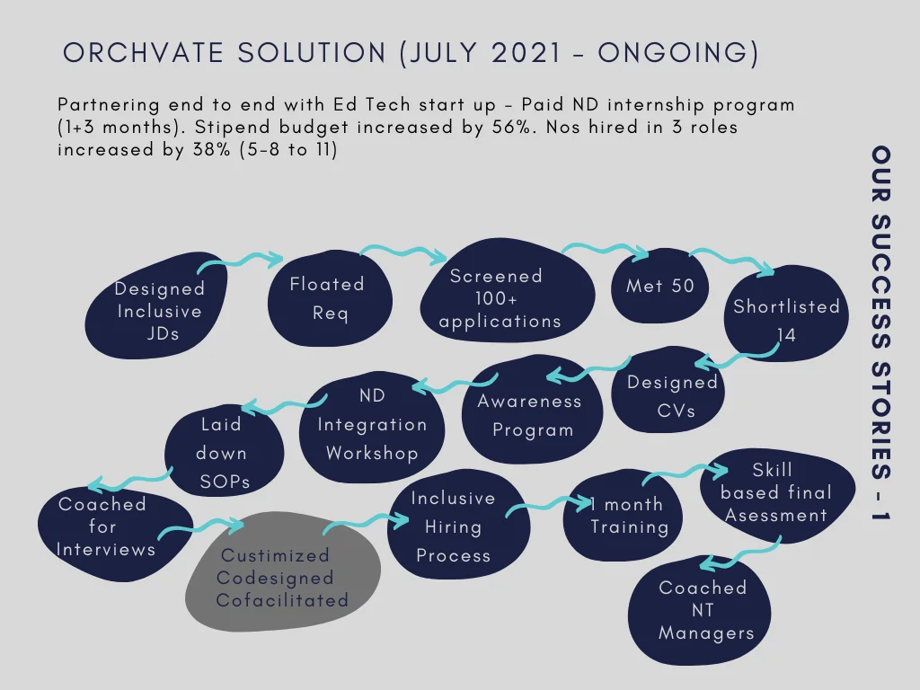 We are partnering with an ed-tech startup to run a paid internship program of 1+3 months period. 11 interns with diverse ND conditions were hired for 3 different roles – Business Development, Content Writing and Graphic Designing.
